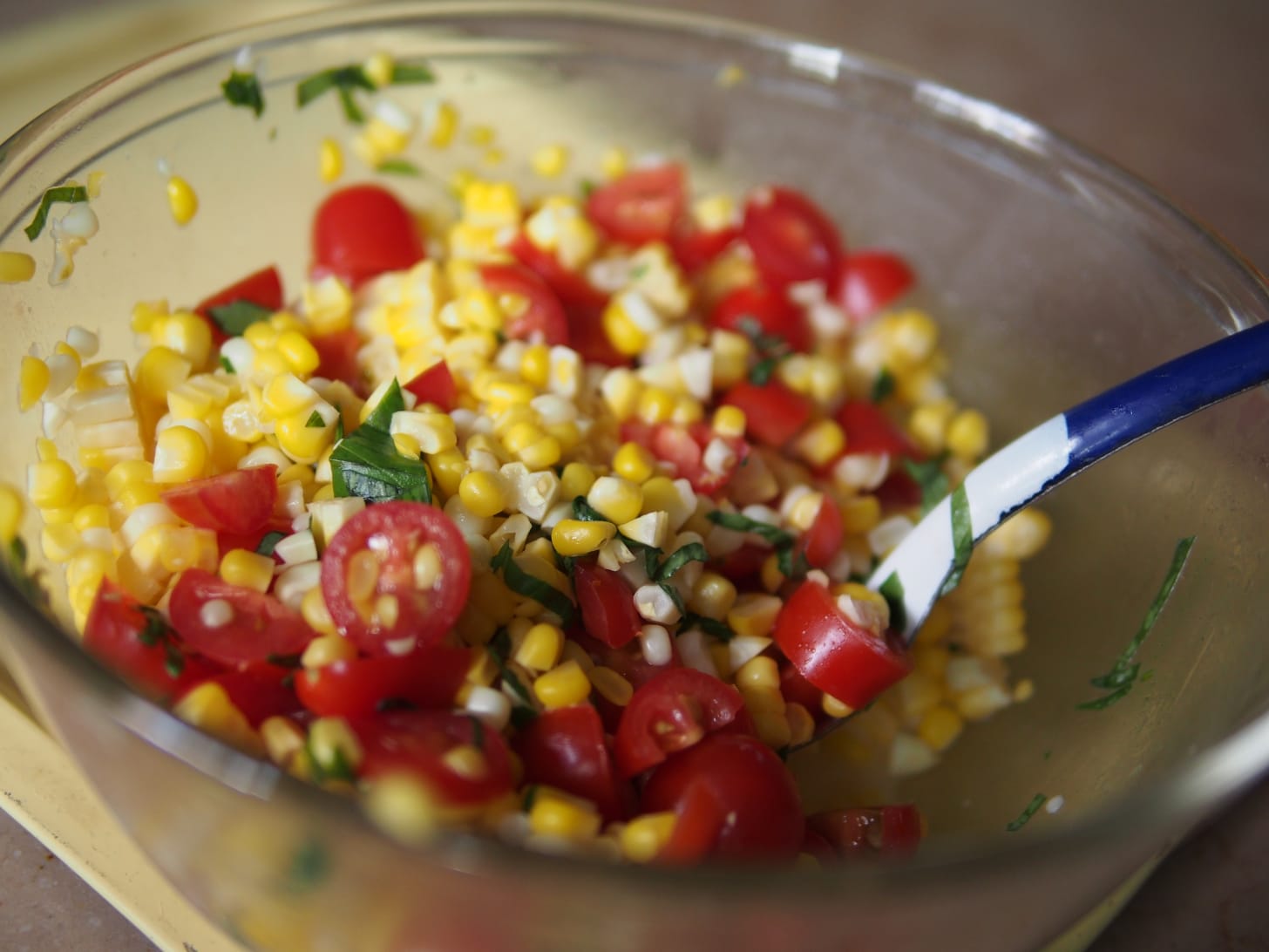This time of year the corn is sweet and crisp and the tomatoes are full of flavor. They hardly need anything else—just some bright green herbs and a dash of olive oil, salt, and pepper.